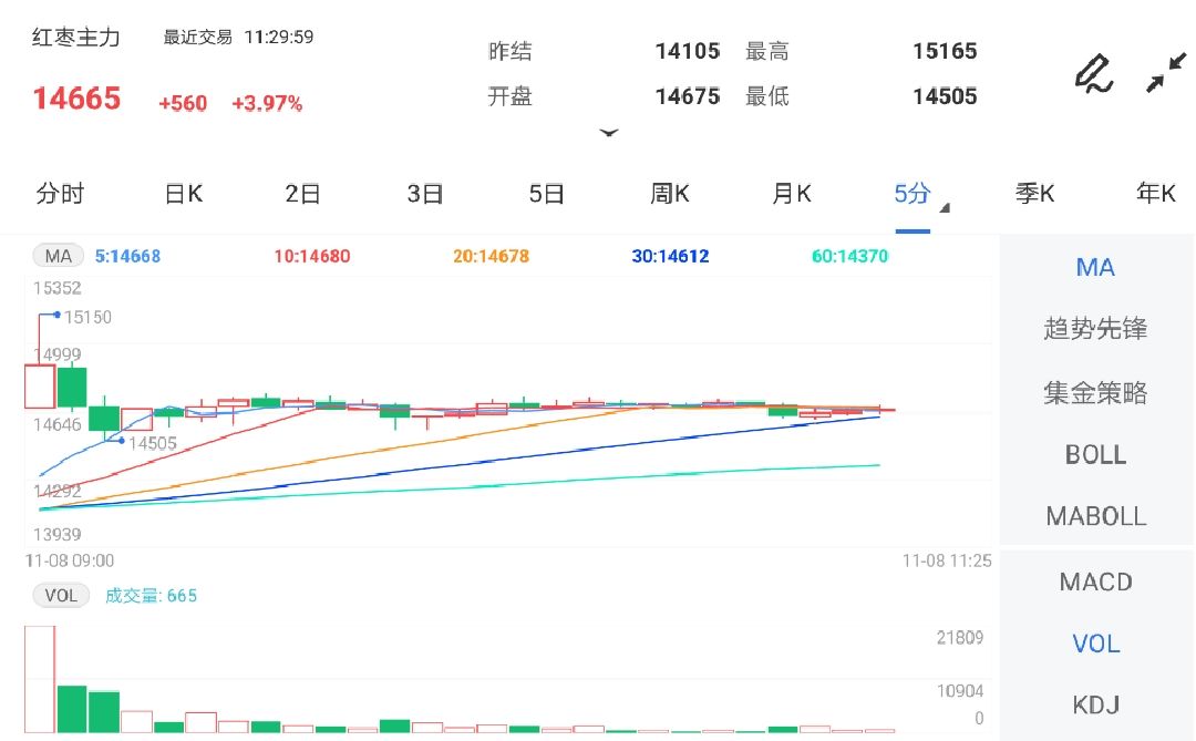 金投网APP行情核心数据显示,截止2021年11月8日下昼15:00收盘,红枣期货主力合约行情讯息:最新价:15455,涨跌:1350,涨跌幅:9.57%,成交量:170513手,开盘价:14675,昨收价:14230,最高价:15490...