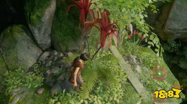 来到下图所示处所,用绳索钩住树枝,然后跳下去,不过先不要摆荡到对面去,回身往回看有一个岩石平台,跳到那里就能拿到宝藏。