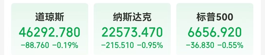 市集方面。美股三大指数整体收跌,道指跌0.19%,纳指跌0.95%,标普500指数跌0.55%。